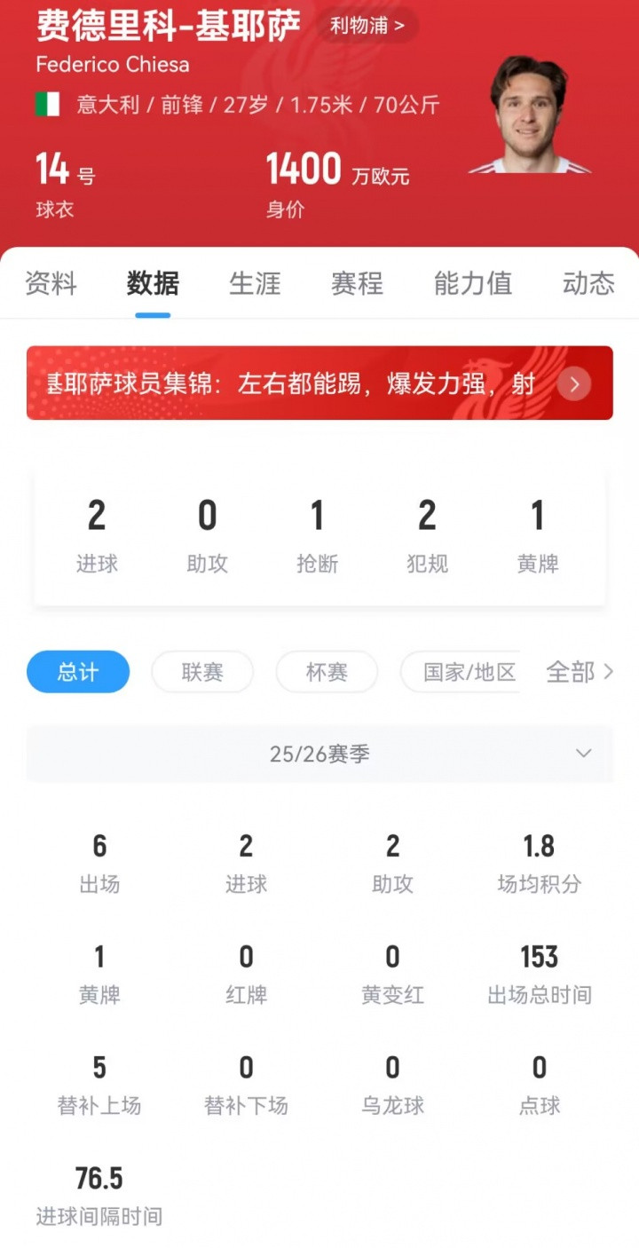 Mùa này, Chiesa đã chơi 6 lần cho Liverpool trong các cuộc thi khác nhau, đóng góp 2 bàn thắng và 2 hỗ trợ, và giá trị ròng hiện tại của cô là 14 triệu euro.
