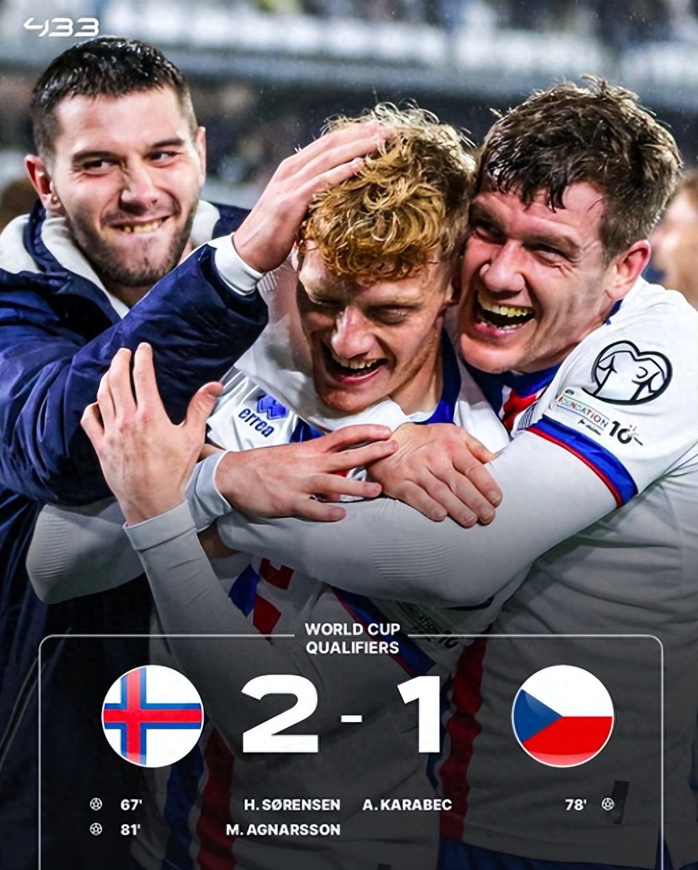 Sáng sớm ngày 13 tháng 10, Bảng L Vòng loại Châu Âu cho Giải vô địch thế giới Mỹ-Canada-Mexico đã diễn ra trong tâm trạng cực kỳ khó chịu. Quần đảo Faroe, xếp thứ 136 thế giới, đánh bại CH Séc, xếp thứ 39 thế giới, 2-1 trên sân nhà. Bụng cá truyền thống ngày xưa đã giành được 3 chiến thắng liên tiếp, lập kỷ lục về số trận thắng liên tiếp ở vòng sơ loại World Cup Quần đảo Faroe và viết lại lịch sử.