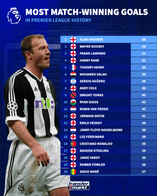 Tiền đạo huyền thoại người Anh Shearer đứng đầu danh sách với 68 bàn thắng, tiếp theo là Rooney (66 bàn), Lampard (61 bàn) và Kane (61 bàn), trong khi huyền thoại Henry của Arsenal xếp thứ năm với 59 bàn.